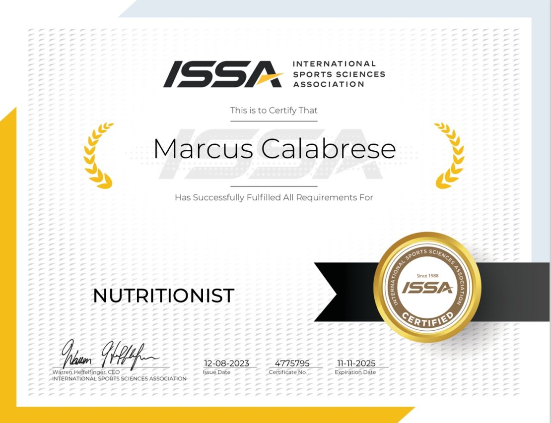 Fuel matters just as much as fitness. This certification from the International Sports Sciences Association, a global leader in health education, ensures that nutrition coaching goes beyond quick fixes or fad diets. Every plan is designed to be realistic, balanced, and supportive of your long-term goals — whether that’s improving athletic performance, managing weight, or simply having the energy to enjoy daily life. Clients benefit from guidance that connects what happens in the gym to what happens in the kitchen, creating a complete path toward results that last.